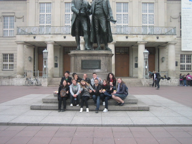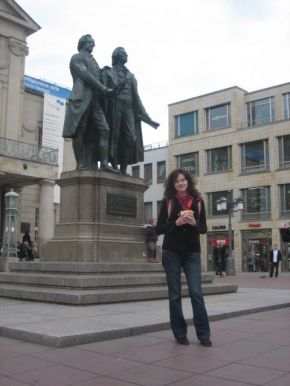 weimarban az első érdekesség a kéknapszemüveges roberto strano, aki ugyanakkor ugyanott ugyanazt fényképezte amit én 2 orosz lánnyal. megkértük, hogy fényképezzen le hármunkat, majd beszélgetni kezdtünk. kiderült, hogy ő szicíliai, csak göttingenben tanul jelenleg. ő is egy nagyobb csapattal járta weimar utcáit, mint mi, és többször összeszaladtunk véletlenül, aztán a vonaton is együtt utaztunk erfurtig. az első szicíliai, akit megismerek!!! hát nem hiába tettem fel szicíliát a visionboardomra, ugye? a többi érdekesség weimarban már ismertebb nevekhez fűződik, mint pl goethe vagy schiller. ők valamikor ott lakoztak weimarban, ezért van ott nekik házuk, szobruk, terük, utcájuk, múzeumuk, ligetük, ezeket nézegettük el, miközben rostbratenwurstot ettünk ketchuppal és csípős mustárral. nekem leginkább goethe nyaralója tetszett. ide úgy lehet eljutni, hogy szinte kiméssz weimarból, átméssz az ilm folyón, majd egy nagy mezőn, közben nagyon nézed a gyerekeket ahogy bumerángoznak, majd végül megérkezel egy kicsi mesebeli házikóhoz. na akkor tudod, hogy ez az a hely, ahol goethe annyit kínlódott a fausttal. goethe is szerette olaszországot (szicília, szicília….) és szeretett volna magának itthon egy kis házat udvarral, kerttel, itt-ott bokrok között elrejtett padokkal, hogy olasz környezetben érezhesse magát (na jó, ő toscana párti volt) így született meg az ő nyári rezidenciája, ahol én egy padon ülve hirtelen a semmiből úgy megkívántam a sört.